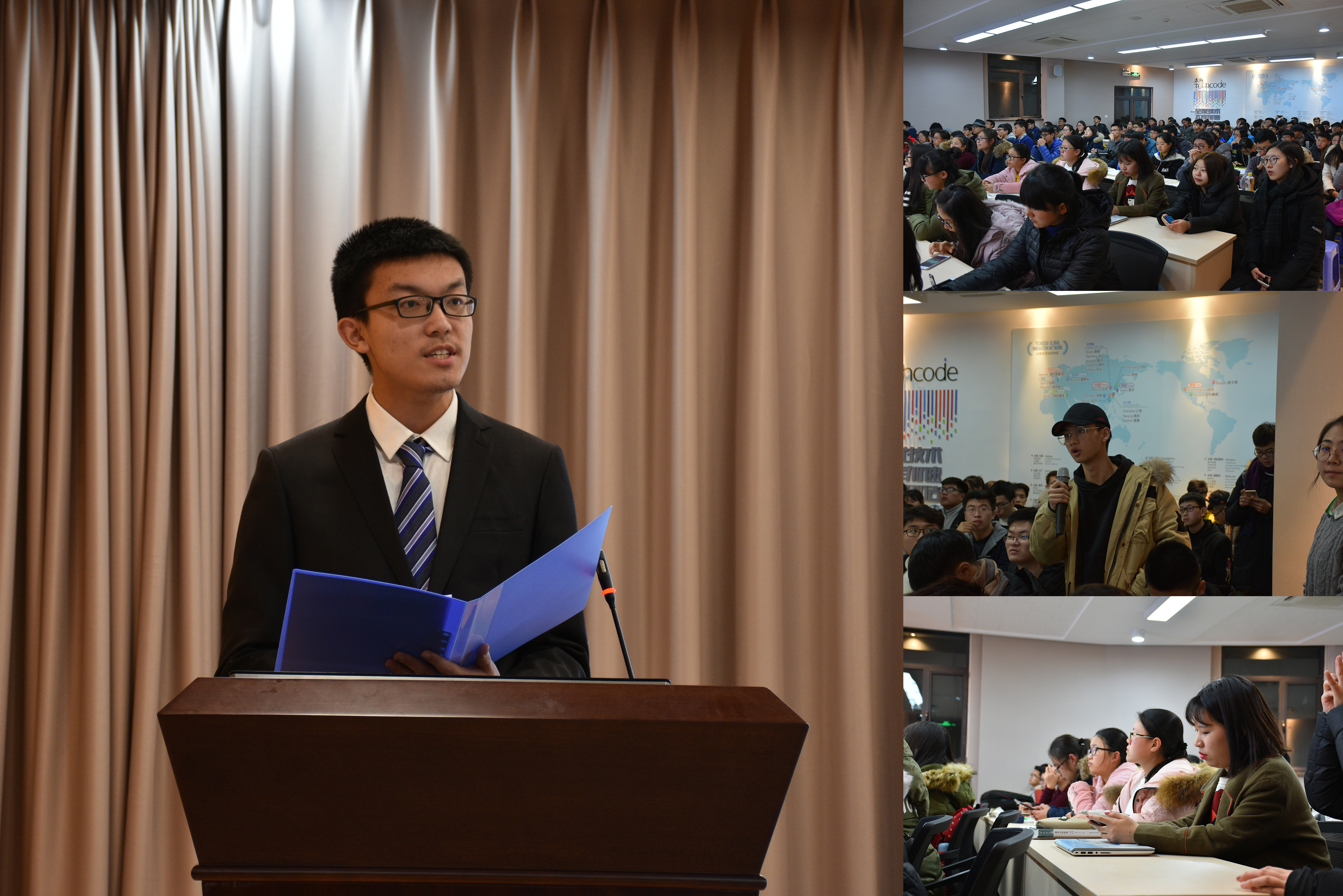 随后,我们的杰出校友孔翔学长,以一个创业成功者的身份站在台上,为同学们带来风趣精彩的感悟与建议。孔翔学长激励同学们积极参加比赛,让自己成为有故事的人。他呼吁同学们去认识外面的世界,承担社会责任,发现社会需求,并以之作为创业的最好基础。孔翔学长以己为例,阐述了创业的深层价值与社会意义,并就现阶段同学求职困难、求职犹豫的现状,提出了自己的建议。孔翔学长的精彩分享犹如一盏指路的明灯,给了想要创业的同学们一份很宝贵的经验,阐释了创业的更深层的意义所在,让同学们更加对未来的方向更加明确。