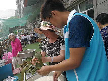 讲座结束,志愿者们再次来到院子里,发现桌子上早已经摆好了丰盛的午餐,当然也少不了志愿者们和家人们包的粽子。爷爷奶奶们热情的给志愿者们递着粽子,“再吃一个,再吃一个”,志愿者们抵挡不住家人们的热情,吃到撑。